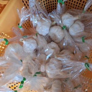 現在は出荷する店舗も増え、にんにくの収穫も安定してきているので、ひとつの店舗に20~30袋作って出荷しています。遠い場所に出荷するときはにんにく用のネットにいれてシーラーで止めて出荷しています。