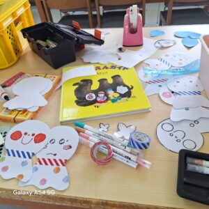 ひとり1枚ずつしおりを仕上げることになりました。私も猫と犬のしおりを1枚ずつ手書きです。