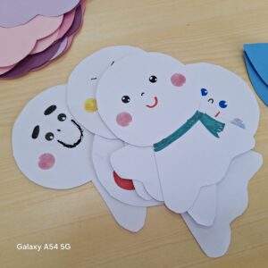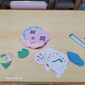 • 折り紙の傘・あじさい・カエル・てるてる坊主などを生徒と一緒に作って貼る