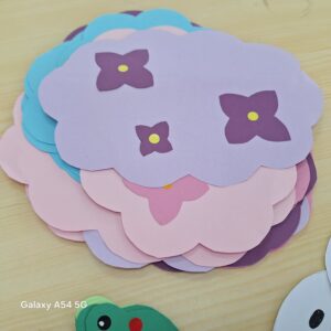 これを多めに作って窓に貼れば、6月のあじさいや梅雨の雰囲気を感じさせる展示物が出来上がります。